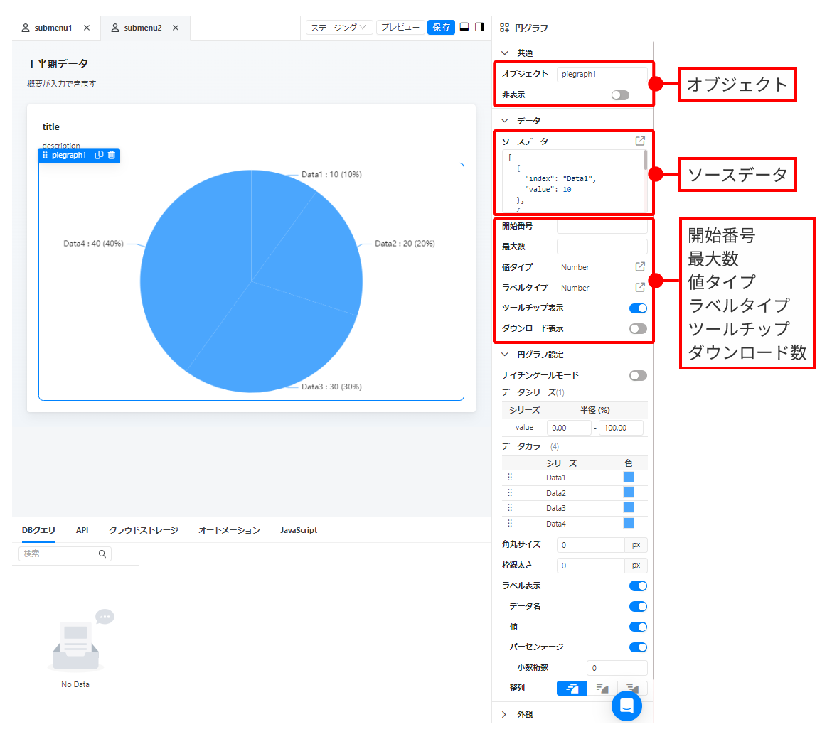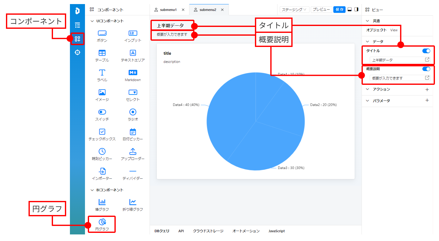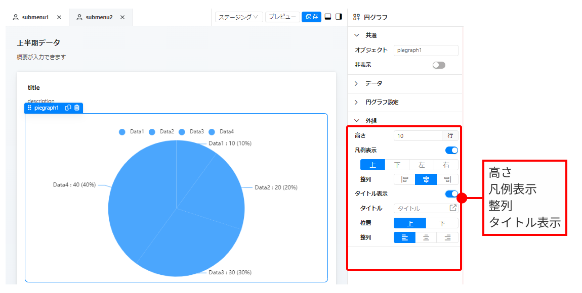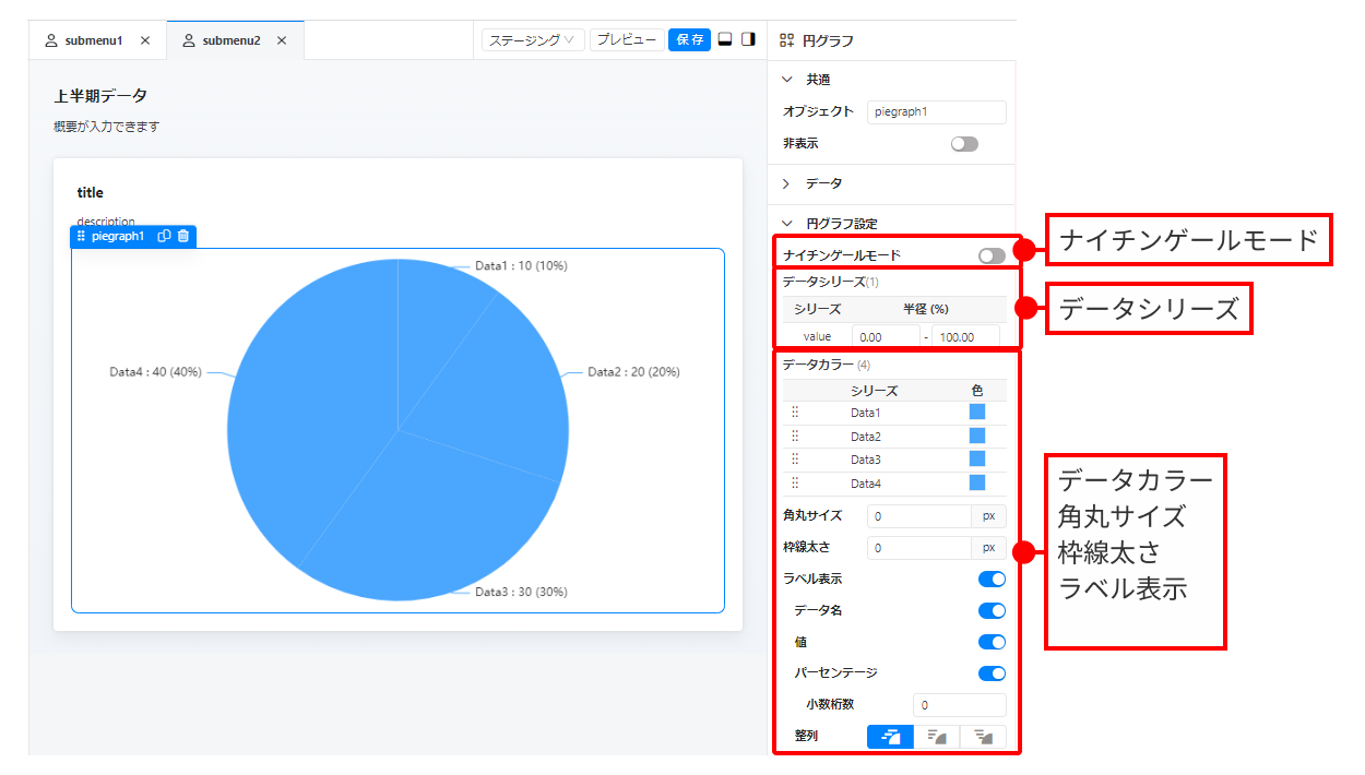 配置された円グラフコンポーネントをクリックするとプロパティパネルが表示されます。
