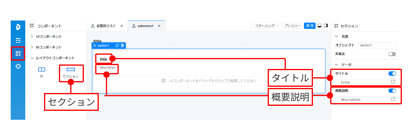 * Sectionをドラッグ＆ドロップすると、そのオブジェクトが自動的に `section1`、`section2`... と名付けられます。