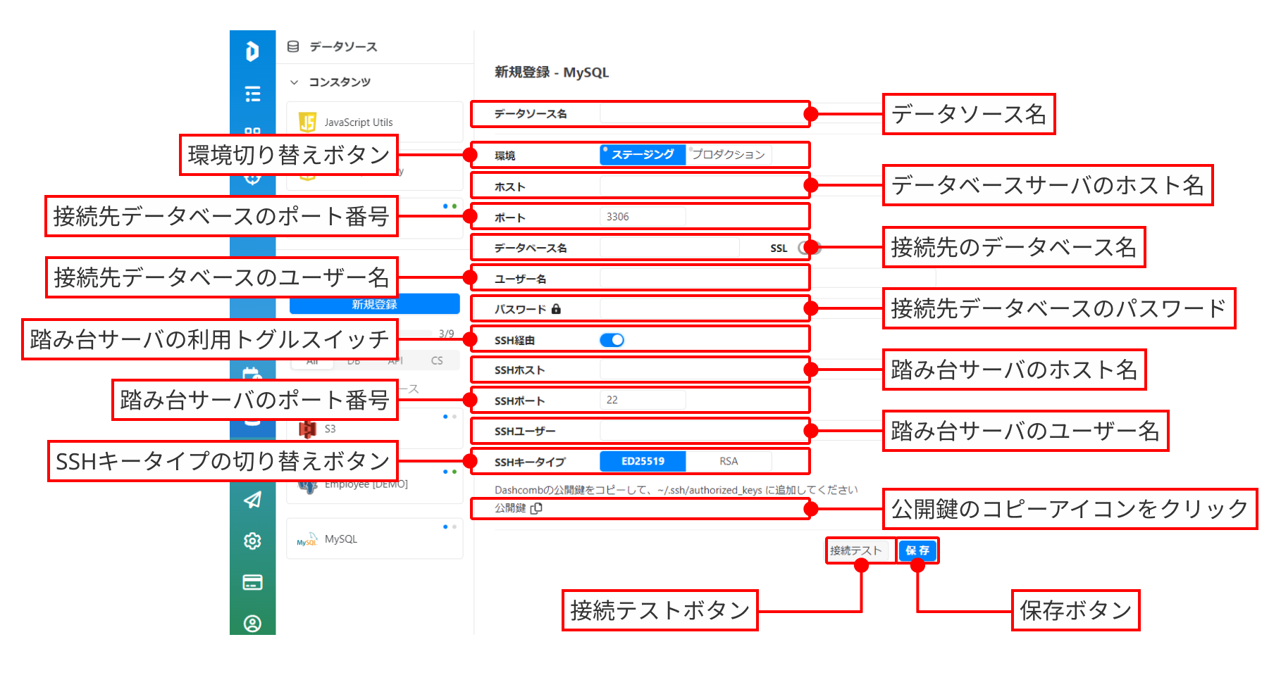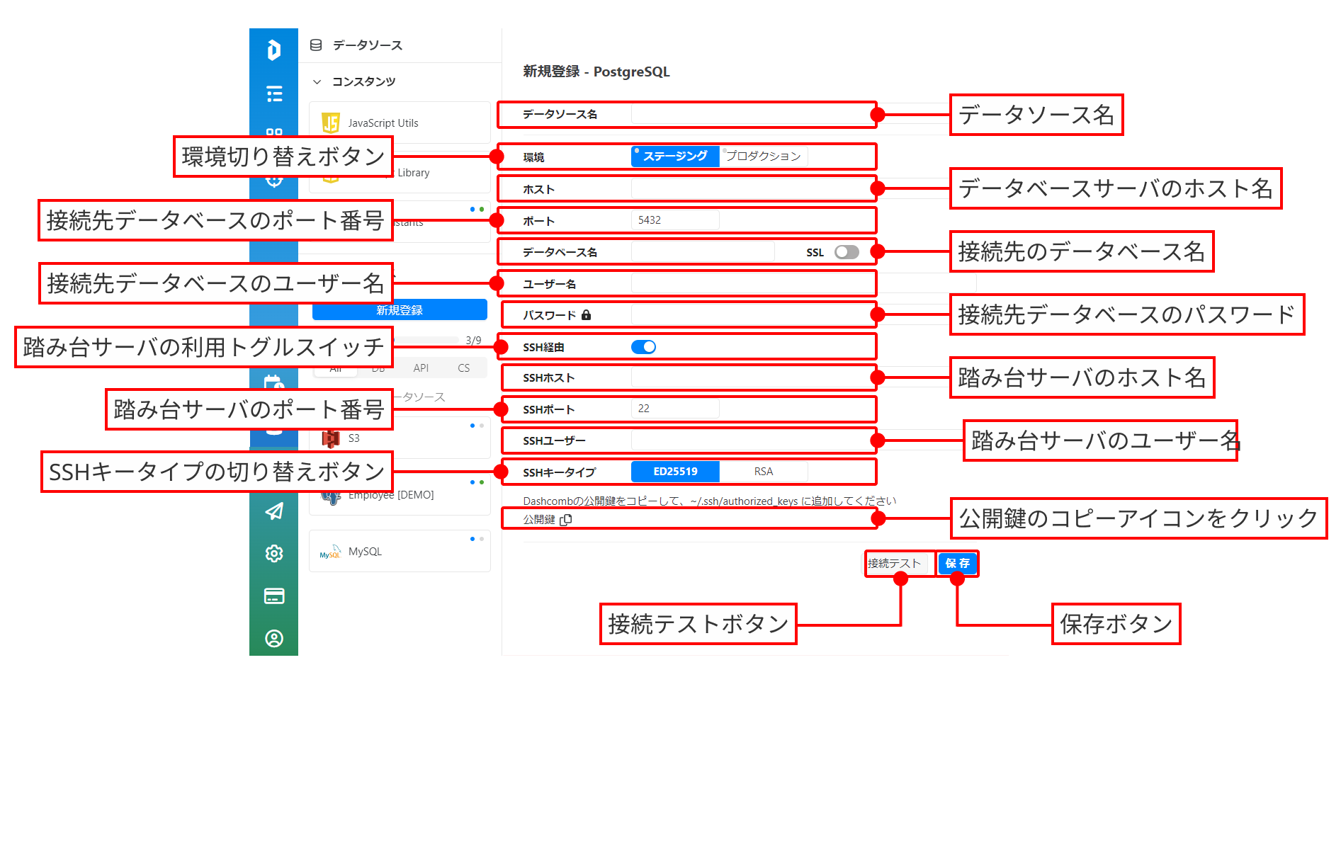 <table data-full-width="false"><thead><tr><th width="184">項目名</th><th>設定内容</th></tr></thead><tbody><tr><td>データソース名</td><td>作成するデータソースの名称を入力します。<br>Dashcomb内では、ここで設定した名称がIDE画面で表示されます。</td></tr><tr><td>環境</td><td>設定するデータベースの環境種別を選択するボタングループです。<br>選択を切り替えることで、同一データソースに対してステージングサーバとプロダクションサーバの接続先を設定することができます。</td></tr><tr><td>ホスト</td><td>接続先データベースサーバのホスト名を入力します。</td></tr><tr><td>ポート</td><td>接続先データベースサーバのポート番号を入力します。</td></tr><tr><td>データベース名</td><td>接続先データベース名を入力します。</td></tr><tr><td>ユーザー名</td><td>接続先データベースのユーザー名を入力します。</td></tr><tr><td>パスワード</td><td>接続先データベースのパスワードを入力します。</td></tr><tr><td>SSH経由</td><td>SSH経由機能のトグルスイッチです。<br>SSHホスト（踏み台サーバ）を経由して接続する場合はオンにします。<br>詳細は<a href="../../../tips-and-tricks/make-a-proxy-server">踏み台サーバ作成</a>をご参照ください。</td></tr><tr><td>SSHホスト</td><td>踏み台サーバのホスト名を入力します。</td></tr><tr><td>SSHポート</td><td>踏み台サーバのポート番号を入力します。</td></tr><tr><td>SSHユーザー</td><td>踏み台サーバのユーザー名を入力します。</td></tr><tr><td>SSHキータイプ</td><td>踏み台サーバへの接続に利用する公開鍵ファイルの種類を選択するボタングループです。<br>公開鍵のコピーアイコン<img src="https://3498714457-files.gitbook.io/~/files/v0/b/gitbook-x-prod.appspot.com/o/spaces%2FgIESKBveovlGvQ1BqYEP%2Fuploads%2Fgit-blob-b7895067eb990dd4165cc21c612ffb0a453a6cc9%2F%E3%82%B3%E3%83%94%E3%83%BC%E3%82%A2%E3%82%A4%E3%82%B3%E3%83%B3.png?alt=media" alt="" data-size="line">をクリックした際に、選択したアルゴリズムの公開鍵がコピーされます。</td></tr></tbody></table>