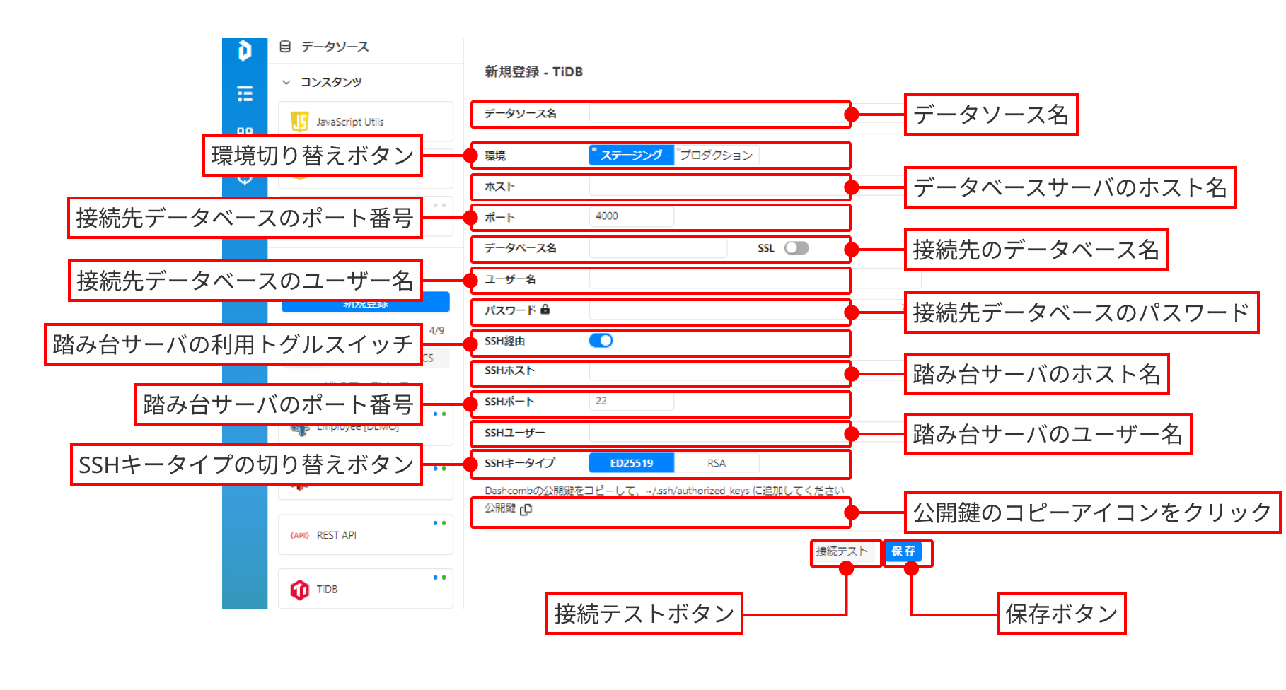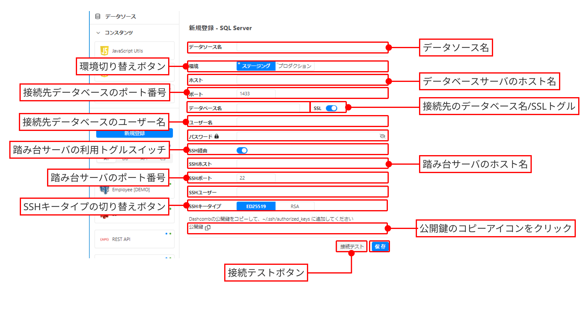 <table><thead><tr><th width="189">項目名</th><th>設定内容</th></tr></thead><tbody><tr><td>データソース名</td><td>作成するデータソースの名称を入力します。<br>Dashcomb内では、ここで設定した名称がIDE画面で表示されます。</td></tr><tr><td>環境</td><td>設定するデータベースの環境種別を選択するボタングループです。<br>選択を切り替えることで、同一データソースに対してステージングサーバとプロダクションサーバの接続先を設定することができます。</td></tr><tr><td>ホスト</td><td>接続先データベースサーバのホスト名を入力します。</td></tr><tr><td>ポート</td><td>接続先データベースサーバのポート番号を入力します。</td></tr><tr><td>データベース名</td><td>接続先データベース名を入力します。</td></tr><tr><td>SSL</td><td><p>SSLトグルスイッチです。</p><p>「encrypt」オプションを利用する場合はオンにします。</p></td></tr><tr><td>ユーザー名</td><td>接続先データベースのユーザー名を入力します。</td></tr><tr><td>パスワード</td><td>接続先データベースのパスワードを入力します。</td></tr><tr><td>SSH経由</td><td>SSH経由機能のトグルスイッチです。<br>SSHホスト（踏み台サーバ）を経由して接続する場合はオンにします。<br>詳細は<a href="../../../tips-and-tricks/make-a-proxy-server">踏み台サーバ作成</a>をご参照ください。</td></tr><tr><td>SSHホスト</td><td>踏み台サーバのホスト名を入力します。</td></tr><tr><td>SSHポート</td><td>踏み台サーバのポート番号を入力します。</td></tr><tr><td>SSHユーザー</td><td>踏み台サーバのユーザー名を入力します。</td></tr><tr><td>SSHキータイプ</td><td>踏み台サーバへの接続に利用する公開鍵ファイルの種類を選択するボタングループです。<br>公開鍵のコピーアイコン<img src="https://3498714457-files.gitbook.io/~/files/v0/b/gitbook-x-prod.appspot.com/o/spaces%2FgIESKBveovlGvQ1BqYEP%2Fuploads%2Fgit-blob-b7895067eb990dd4165cc21c612ffb0a453a6cc9%2F%E3%82%B3%E3%83%94%E3%83%BC%E3%82%A2%E3%82%A4%E3%82%B3%E3%83%B3.png?alt=media" alt="" data-size="line">をクリックした際に、選択したアルゴリズムの公開鍵がコピーされます。</td></tr></tbody></table>