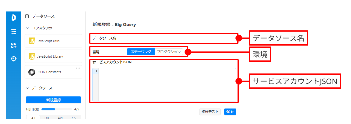 * 接続先Big Queryの「サービスアカウントJSON」を入力します。