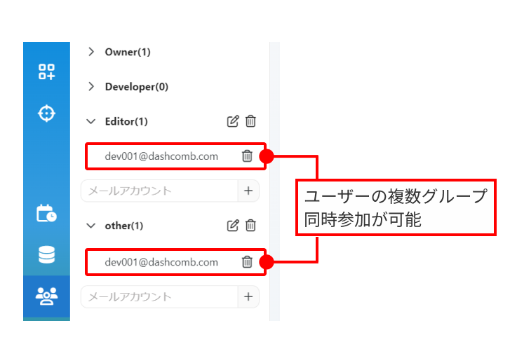 Dashcomb が自動で作成したグループです。Owner とDeveloper の2つがあります。