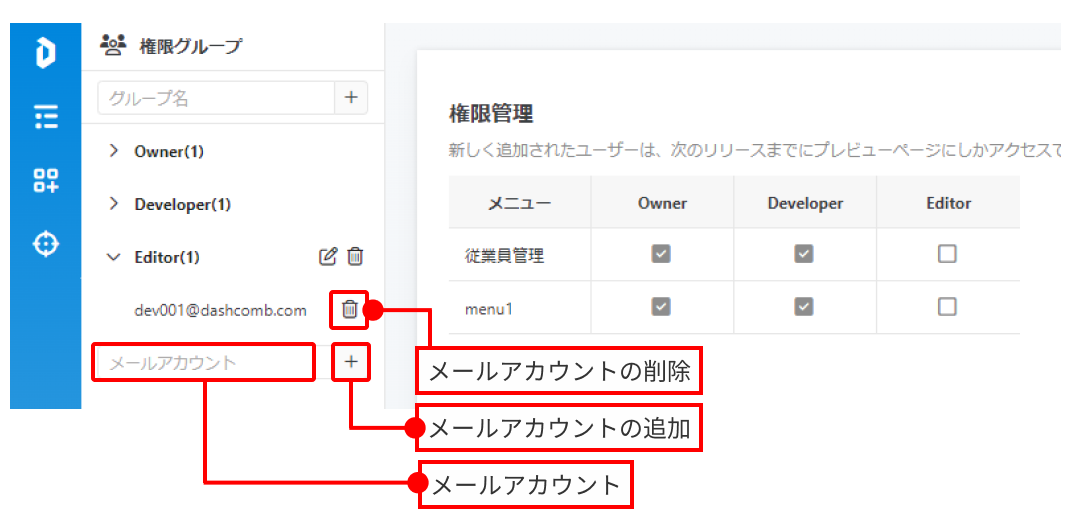 Dashcombではユーザーグループの権限を設定することができます。つまり、グループを作成しておくと、そのグループに権限を振り分けることができます。Dashcombでの権限は「メニュー」単位で分けています。