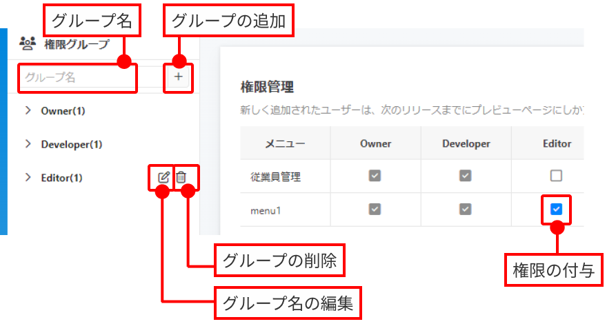 管理画面のニーズにあわせて、権限グループを追加することができます。
