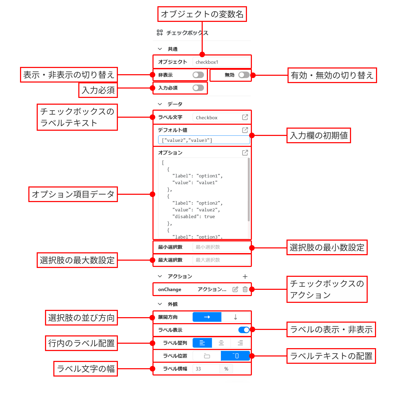 選択肢の詳細な設定を変更できます。Checkboxのオプションの初期値は下記のようなJSON式の配列になっています。