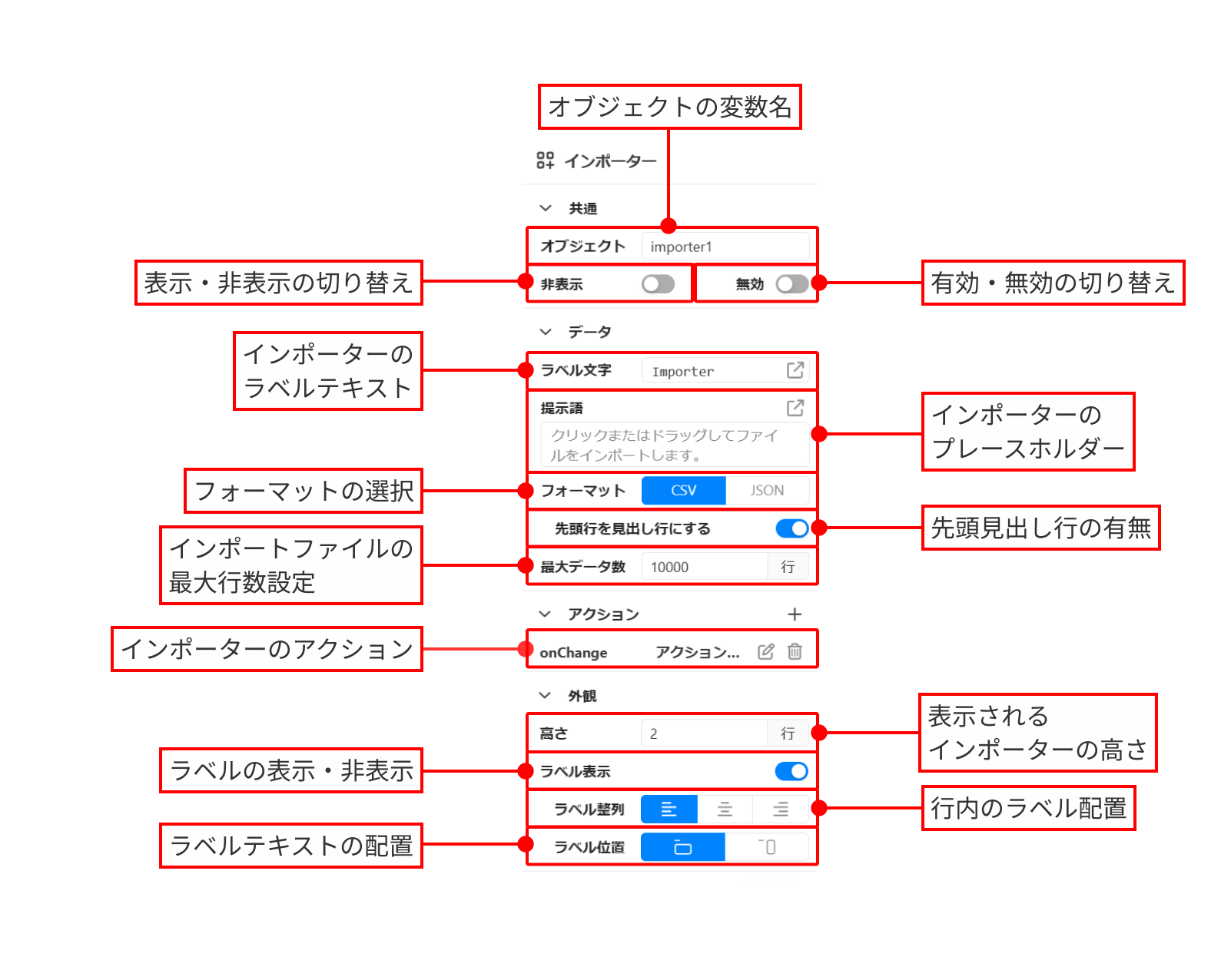 Importerコンポーネントには、以下のプロパティが含まれています。