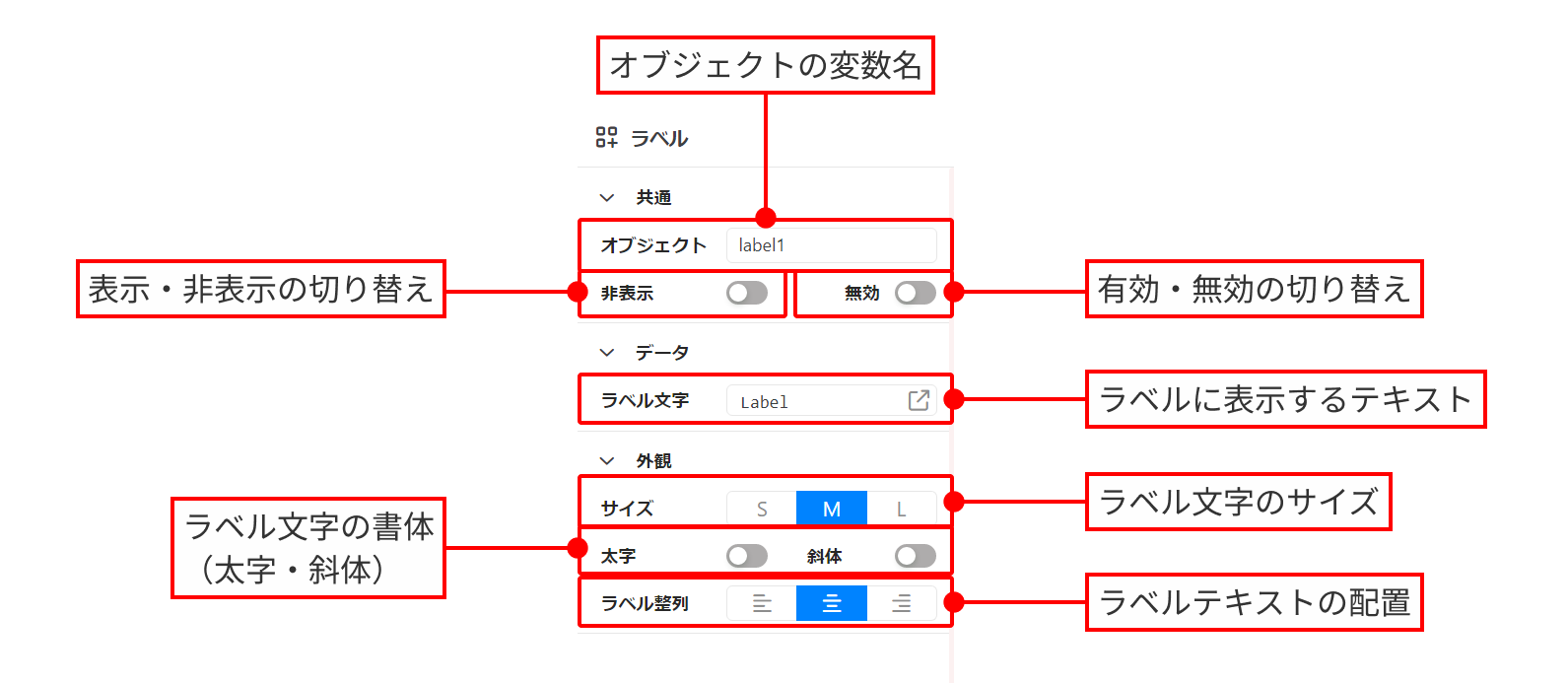 Labelコンポーネントには、以下のプロパティが含まれています。
