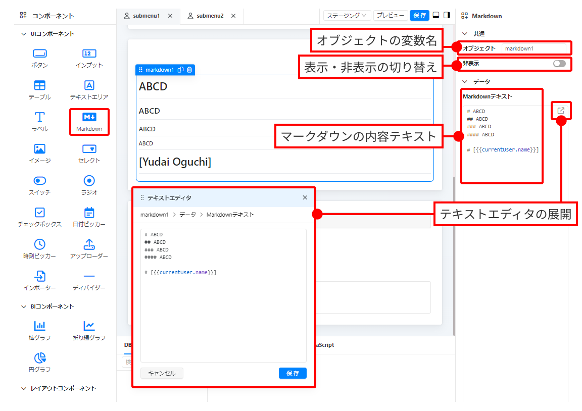 マークダウンオブジェクトの変数名です。Markdownコンポーネントをドラッグ＆ドロップすると、そのオブジェクトが自動的に `markdown1`、`markdown2`... と名付けられます。