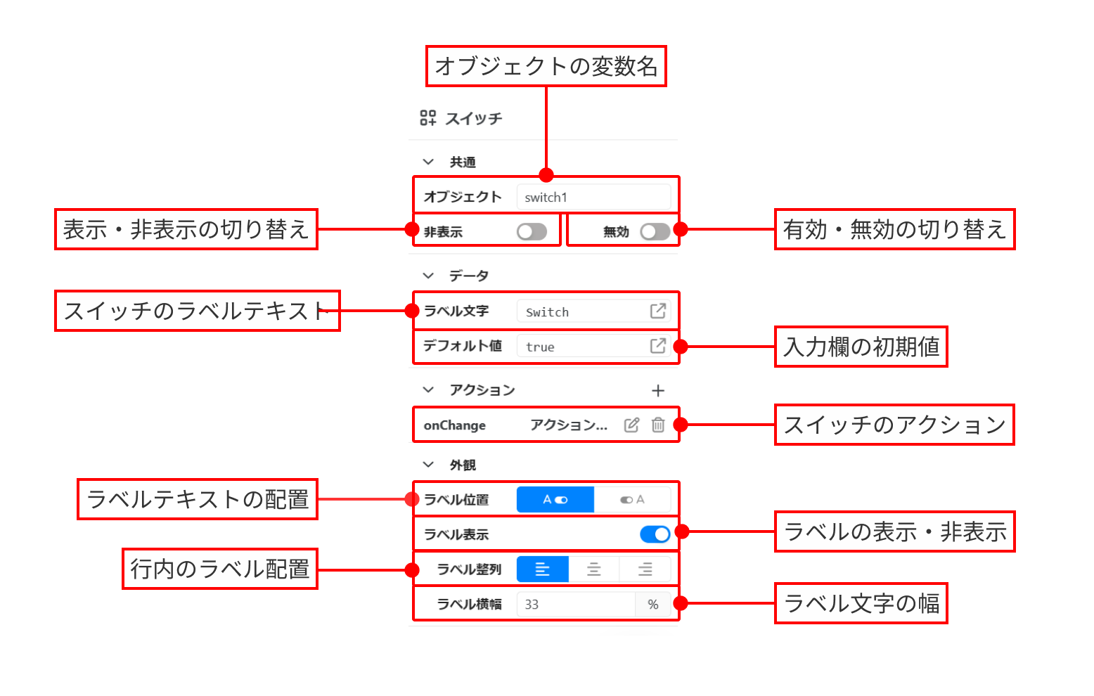 スイッチの項目名を表すラベルテキストです。Switch コンポーネントをドラッグ＆ドロップすると、自動的に `Switch` に設定されます。