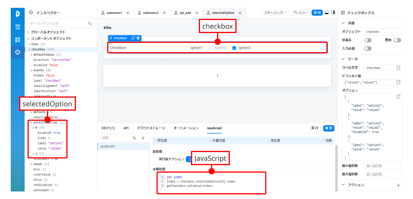 RadioBox、CheckBox、Selectの選択結果に対して、**selectedOption**で属性をJSで取得できます。