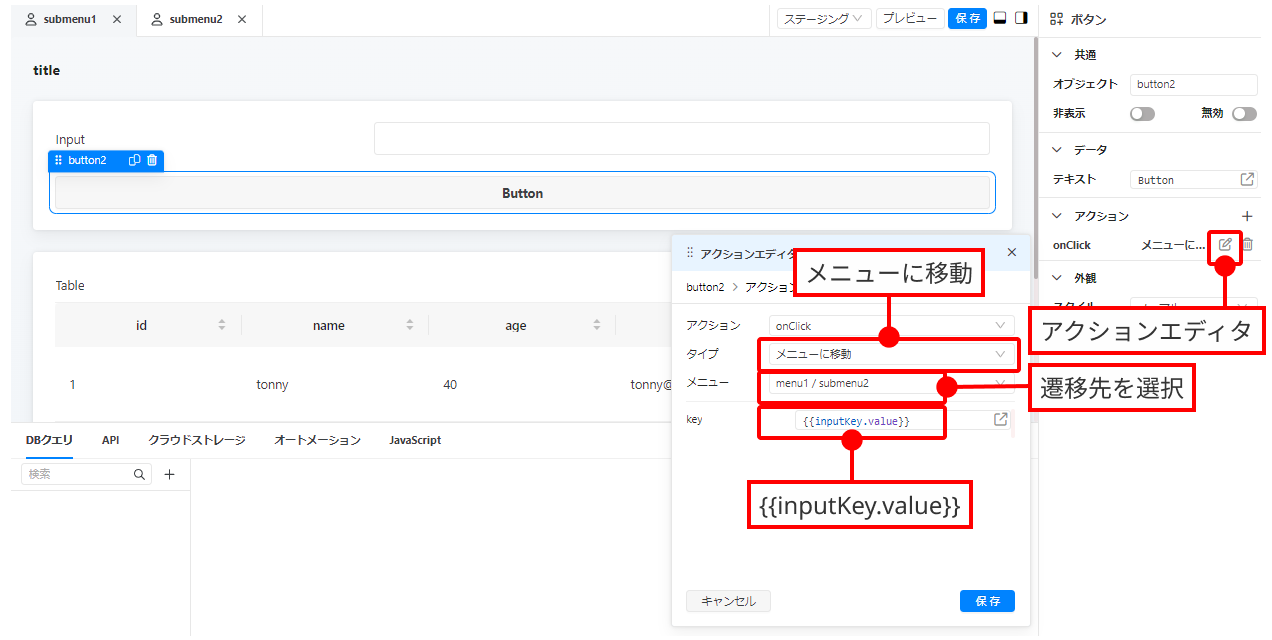 「onClick」横のアイコンをクリックして、アクションエディタを呼び出します。