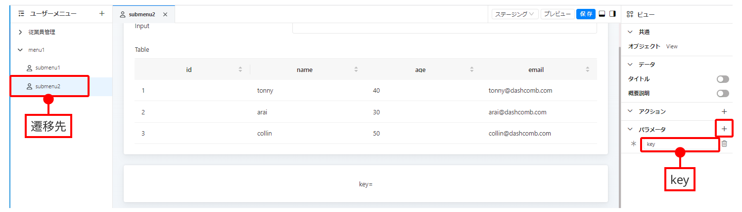 Dashcombが提供しているメニュー、View、UI Componetを使って、パラメータ付きの画面遷移を簡単に実現できます。もちろん、パラメータなしの画面遷移はパラメータを設定しなければ、もっと簡単に実現できます。