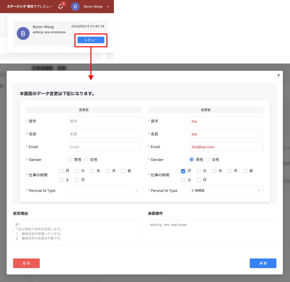 通知システムにより、承認者は変更がリクエストされた直後にすぐに通知され、迅速かつ効率的に対応できます。さらに、システムはユーザーに変更の理由を提供するよう促し、責任と透明性を確立するのに役立ちます。承認者が変更を拒否する場合は、その理由を提供する必要があり、ユーザーがなぜ変更が拒否されたのかを理解し、どう修正する必要があるかを把握できます。