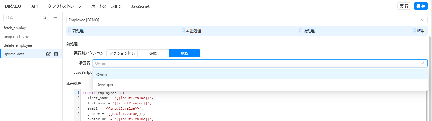3. 承認者を選択：ドロップダウンから、データ操作を承認する権限グループを選択します。グループが選択されたら、「保存」ボタンをクリックします。